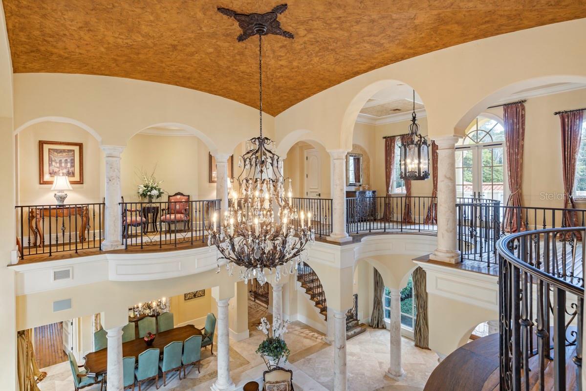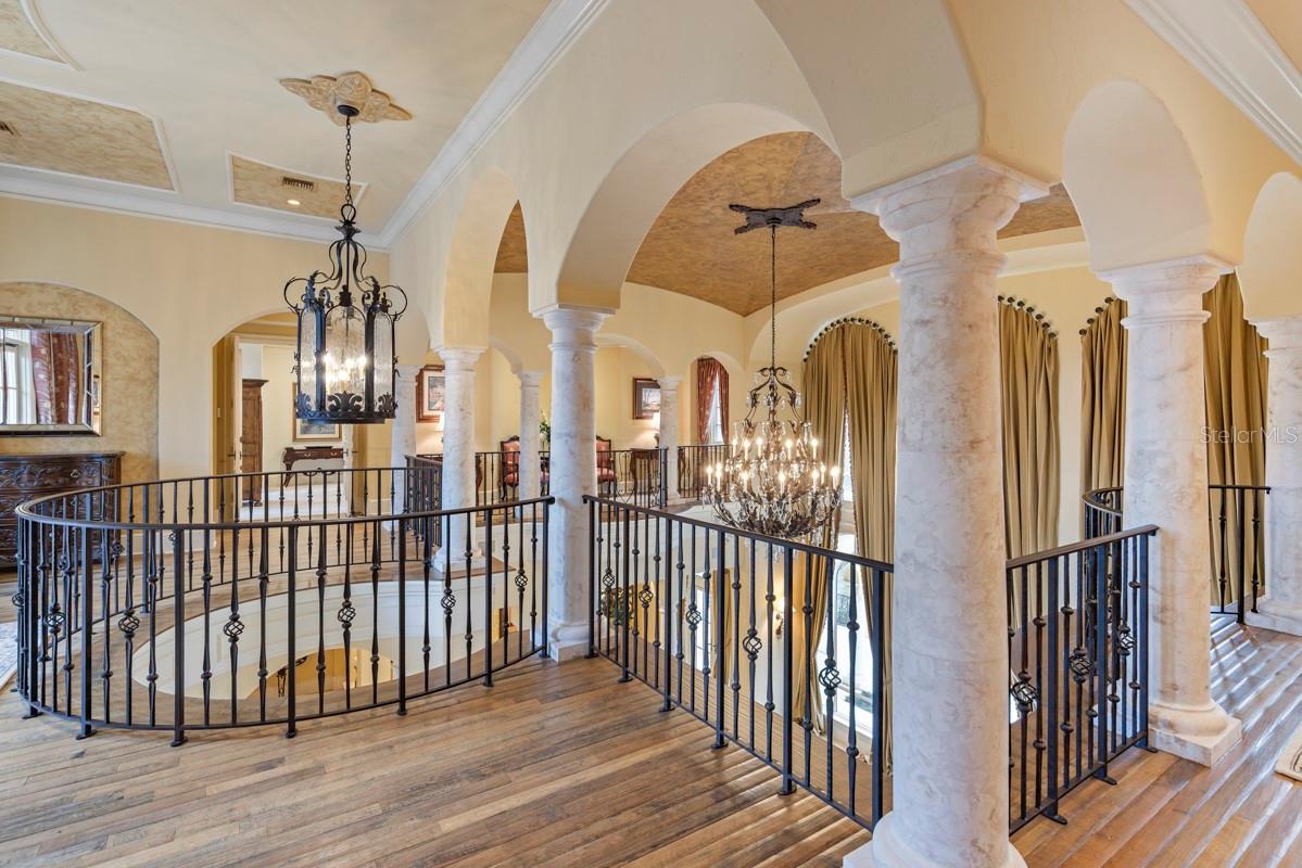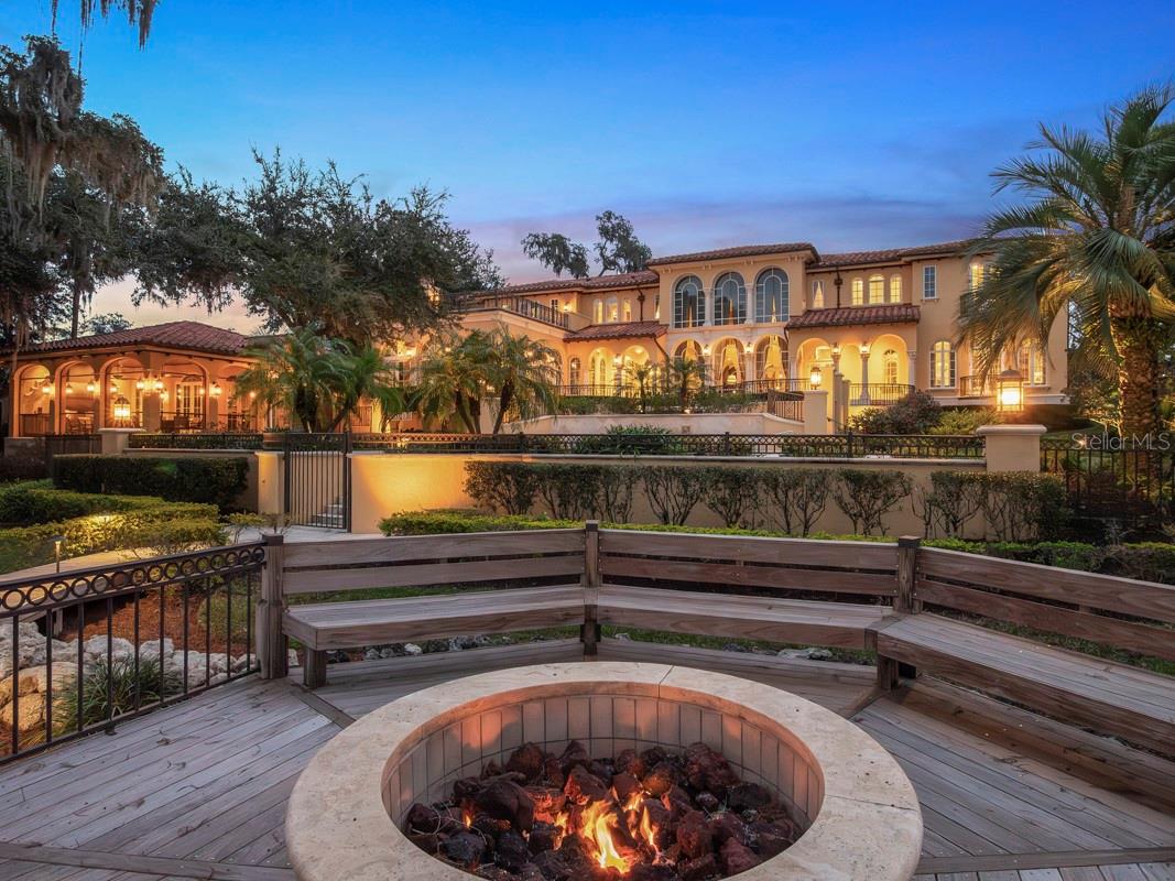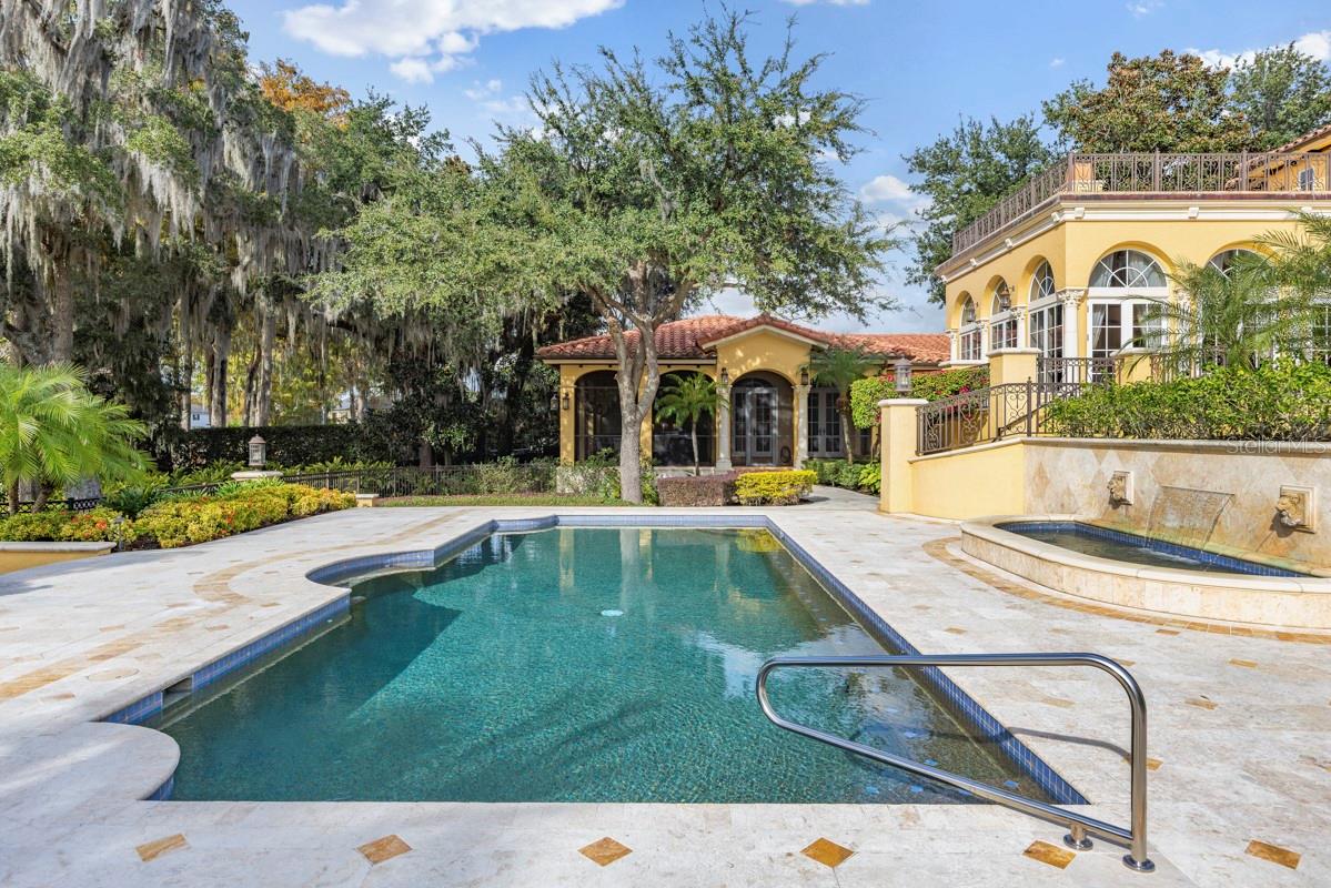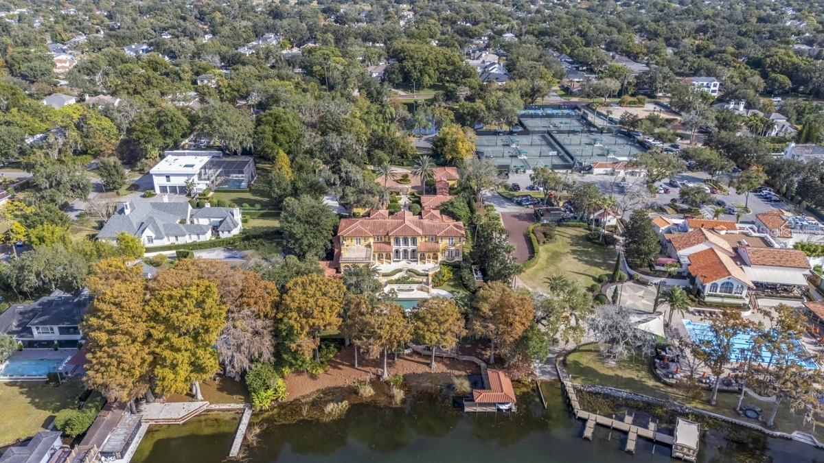 Elegant Mediterranean estate, masterfully crafted by Akers Custom Homes and set within the heart of the Vias. Privately tucked behind a gated drive, the approach unfolds to a grand circular motor court framed by lush, manicured grounds spanning over two acres with impressive sunset views across Lake Maitland. Every element of the estate is thoughtfully connected by covered walkways, including five garages (three-car and two-car) and two motor courts, a detached office or seventh bedroom suite, and a lakeside pool cabana, creating a seamless blend of function, elegance and architectural harmony in this one-owner Lake Maitland residence. A dramatic arrival sets the tone as a flowing water feature guides guests along the walkway to the front entry. Inside, the grand foyer opens to a breathtaking gathering room, anchored by soaring two-story windows that frame panoramic lake views, the expansive terrace and terraced outdoor space. A dedicated space for a grand piano enhances the home’s capacity for elegant entertainment and memorable gatherings. The spacious kitchen overlooks the family room and is positioned alongside a dedicated bar, breakfast room and dining room. The family room, warmed by a gas fireplace, is filled with natural light and opens through a wall of French doors to the open terrace, blurring the line between indoor and outdoor living. The first-floor primary suite is a serene retreat with French doors to a covered outdoor space, a fireside sitting area wrapped in custom bookshelves, and a spa-inspired bath featuring a large glass shower, soaking tub, expansive walk-in closet, and a versatile flex room ideal for yoga, massage or expanded wardrobe space. A full guest suite with en-suite bath and walk-in closet is also on the main level. Upstairs, a grand mezzanine overlooks the gathering room, offering a dramatic extension of the living areas. French doors open to a front balcony, while the west wing features two bedrooms with a shared private living room and full bath. The east wing hosts two additional bedroom suites, each with walk-in closets and en-suite baths, one enhanced by a private sitting area and access to a spacious rear balcony. Off the kitchen, a wrought-iron gate leads to the basement level, where a refrigerated wine cellar, theater room, and generous storage space await. Outdoors, the stunning terrace showcases a heated spa, sparkling lakeside pool, expansive gas fire pit and an extraordinary 700-square-foot pool cabana that offers a wraparound screened porch with summer kitchen, a full bar, gaming area and full bath, ideal for lakeside entertaining. Elevated above the water for commanding views and shielded from the main road for complete privacy, this remarkable estate is a masterpiece, designed for multi-generational living and destined to create lasting memories for generations to come.