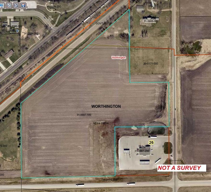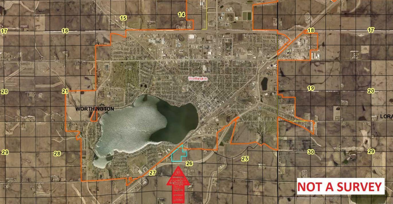 Great development opportunity in Worthington, MN! 27 acres +/- (including road ditches) on Highway 60 and just West of the new Sinclair gas station, this makes a great option for development!! This property is in city limits.